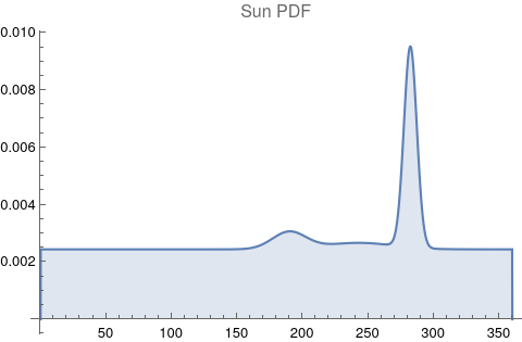 There are obvious spikes for some of these features. Perhaps the dramatic increase in the high 200's for the Sun degrees is most surprising. (There may be more public news events in the northern hemisphere's late autumn and early winter when the Sun would be yearly at these degrees. For example, events around the USA Thanksgiving and Christmas holidays may register more as news-worthy.)